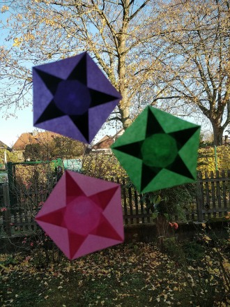 Den Stern auf das erste Transparent-Fünfeck kleben.