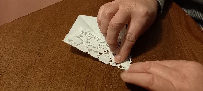 Stelle den Falz treffen. Darauf achten, dass die Spitze