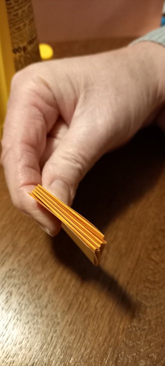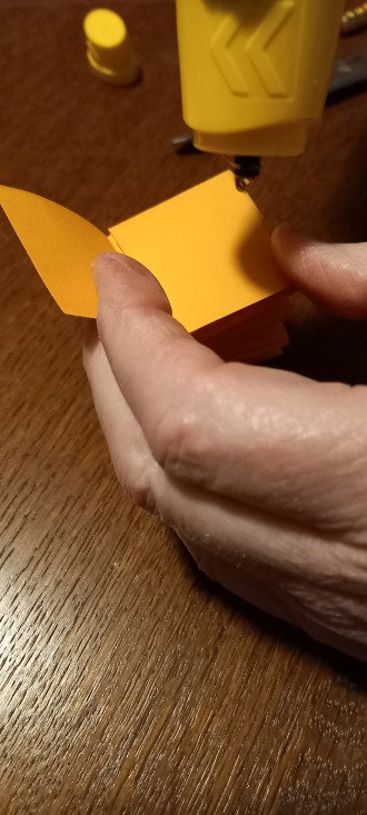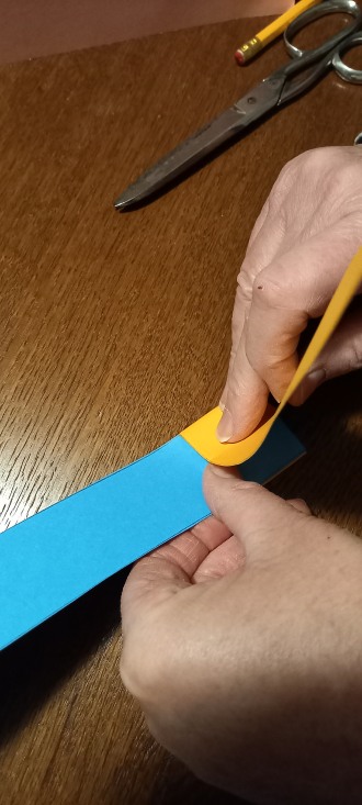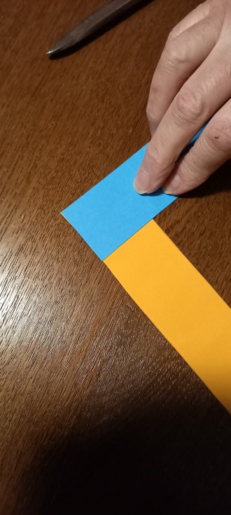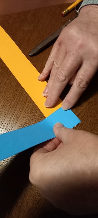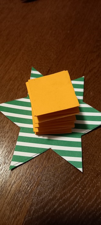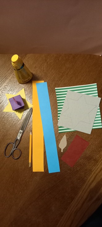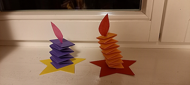 Mit zwei Papierstreifen Hexentreppe machen. Oben und unten zusammenkleben. Auf den Stern kleben. Flamme aus Transparentpapier schneiden, Flammenhals mittig auf die Kerze kleben.