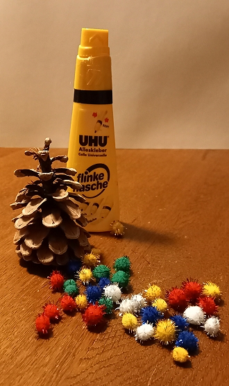 Die Pompons nach Belieben zwischen die Schuppen kleben.