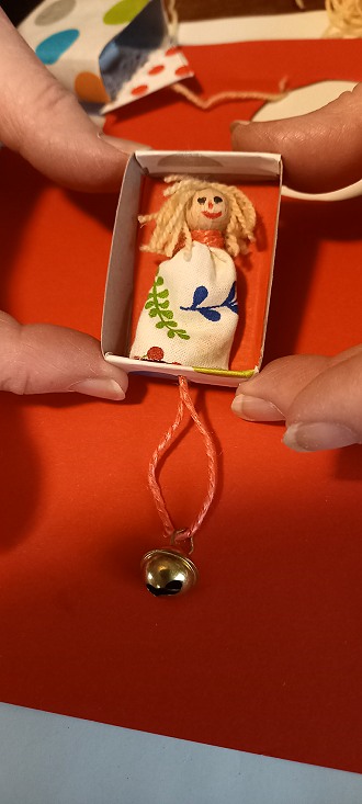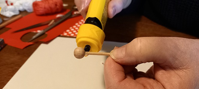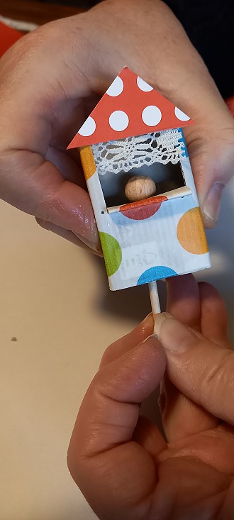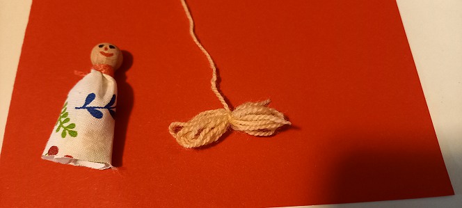 Einen Stoffrest als Kleidchen verwenden, an den Stab kleben,
