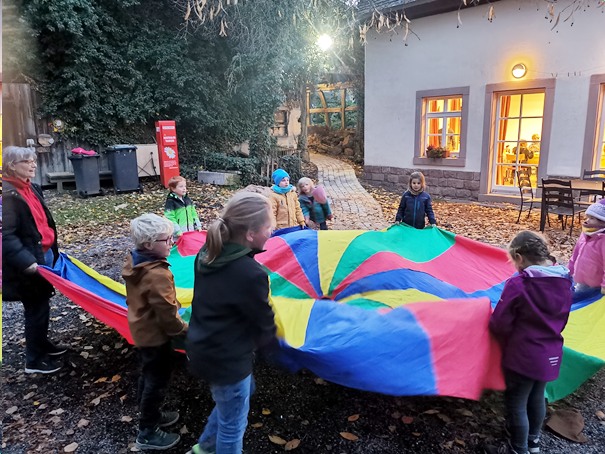 wir auch draußen im Hof spielen. Mit dem bunten Schwungtuch